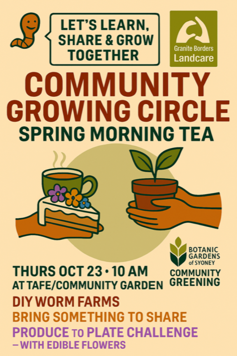 Morning tea and Petal tasting, worm farming at the Tenterfield Community Garden at TAFE. RSVP to Gail Galloway: 0407 359 614